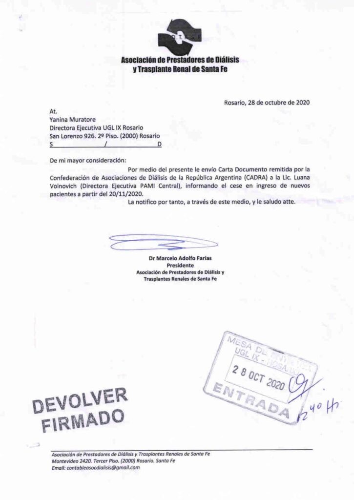 Por decisión de la Confederación de Asociaciones de Diálisis de la República Argentina, los Centros de Diálisis del territorio nacional no recibirán nuevos pacientes renales crónicos. La Carta Documento fue remitida por la organización a la Lic. Luana Volnovich, directora ejecutiva del Pami Central. Allí se especifica que desde el 20/11 no se dará ingreso a nuevos pacientes.