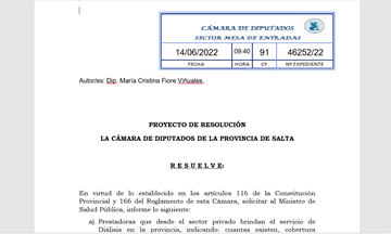 Allí, además, consultan al ejecutivo por la “cantidad de personas empadronadas en la provincia, distinguiendo los diferentes departamentos” y quieren conocer los valores actuales de la cápita. Centralmente quieren conocer en ese pedido “cuál es la vigencia actual de convenio entre la Provincia y CEPRIDIASA – Asociación de Centros Privados de Diálisis de Salta” por la prestación del servicio de diálisis en toda la Provincia y “el grado de cumplimiento del acta acuerdo “.