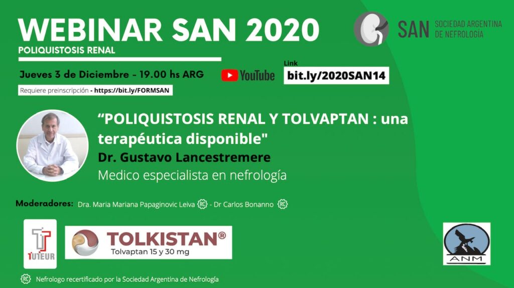En el marco de WEBINAR SAN 2020, el Dr. Gustavo Lancestremere, medico especialista en nefrología, estará disertando sobre «Poliquistosis Renal y Tolvaptan: una terapéutica disponible».